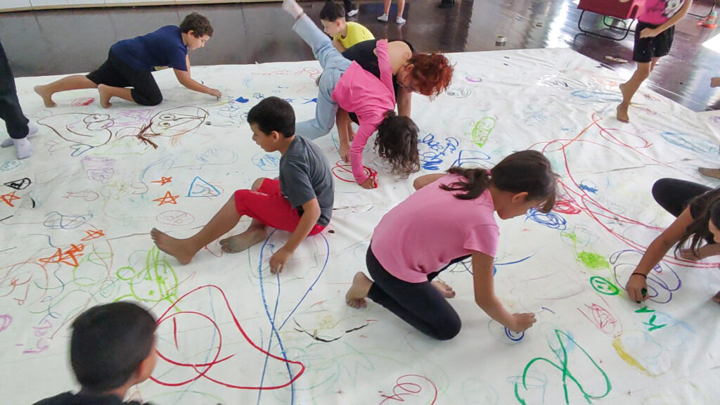 Inspirado na metodologia Segni Mossi, que integra artes visuais e dança, o projeto convida as crianças a desenhar com o corpo inteiro: com as mãos, os pés, o deslocamento, a respiração, o tempo e a relação com o outro. O traço nasce do gesto, da caminhada, da pausa, da repetição e da escuta do próprio corpo.